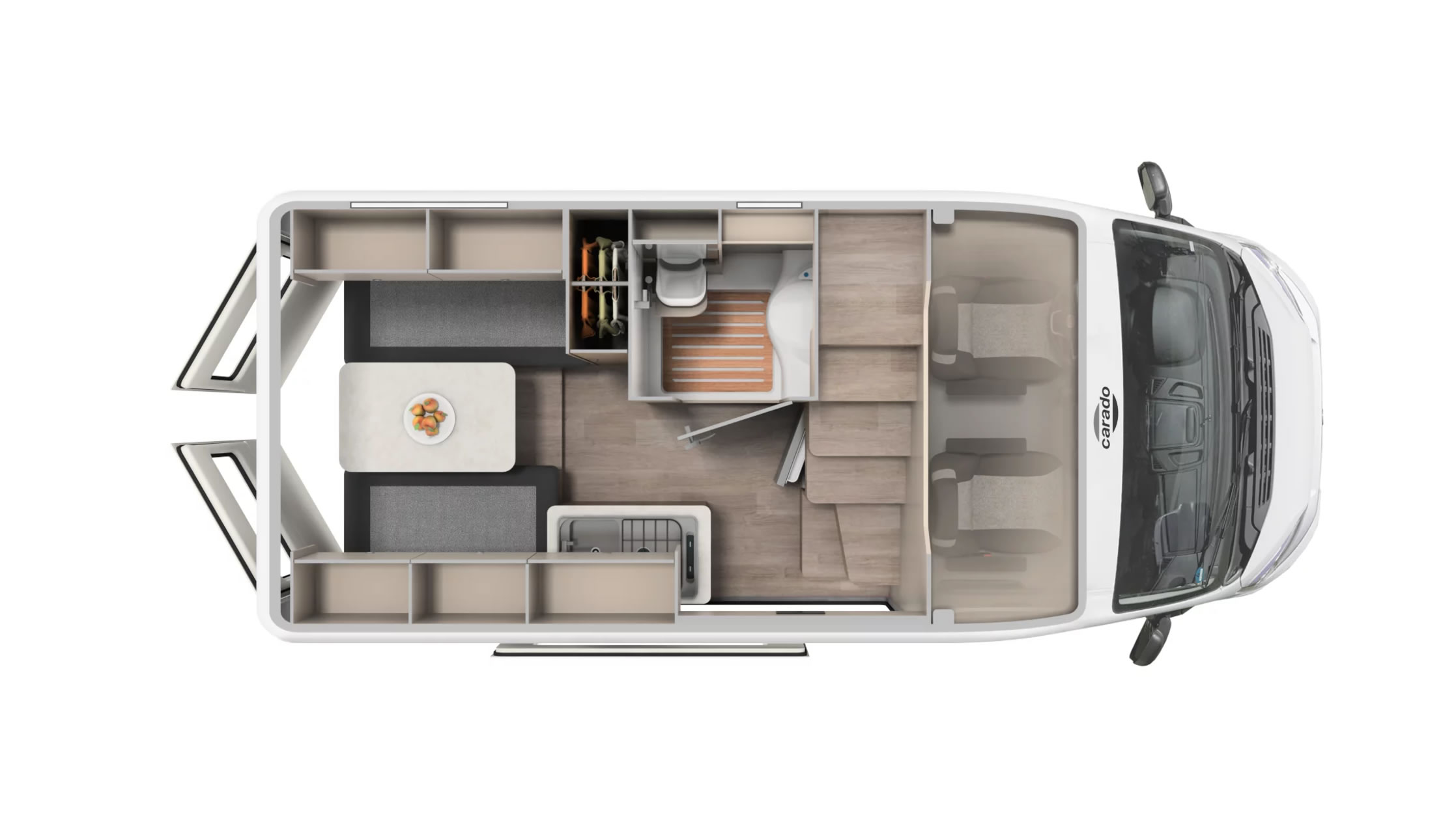 Obytný prostor je jasně oddělen od kabiny řidiče. Tato přepážka vytváří jasnou prostorovou strukturu, zvyšuje soukromí v obytném prostoru a podporuje útulnou atmosféru. Zároveň přispívá k lepší tepelné izolaci a snížení hluku během cestování a pobytu.